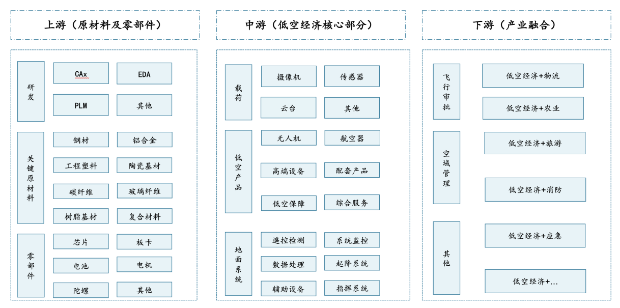 Low-altitude economy covers the upstream, midstream and downstream of the industrial chain, forming a complete industrial system. The upstream of the industrial chain mainly consists of the fields related to raw materials and core components. The midstream of the industrial chain mainly includes the manufacturing of related products such as payloads, low-altitude products, and ground systems, as well as system services and support. The downstream of the industrial chain mainly consists of various application scenarios, including flight approval, airspace control and other various application scenarios.